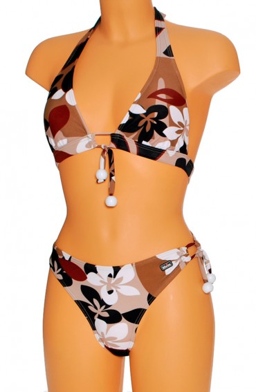 Dames bikini in een fleurige print. Bovenstuk met schuifcupjes. Slip en topje met strik sluiting zodat deze eenvoudig versteld kunnen worden voor een perfecte pasvorm.