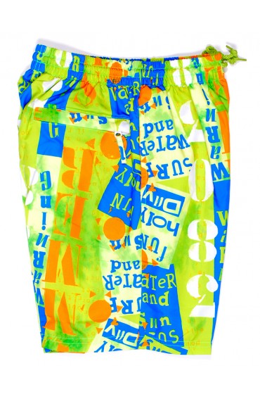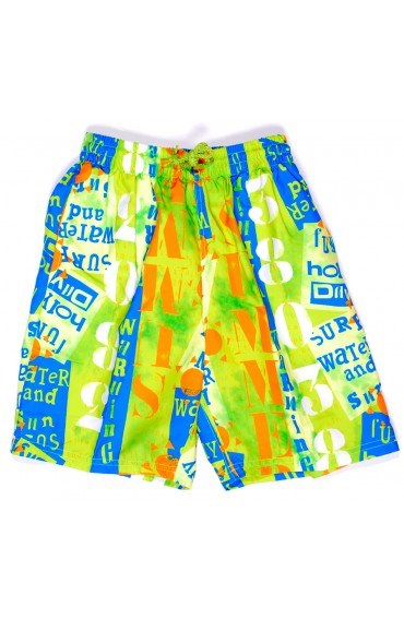 Jongens short met elastieken band en koord aan de buitenkant met 2 steekzakken, achterzak met rits sluiting en binnenbroek. Samenstelling: 100% polyester