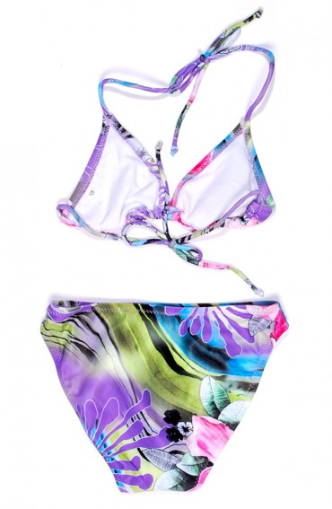Meisjes bikini met vaste driekhoek bovenstuk. Clipsluiting op rug Versierd met vaste strik op bovenstuk en aan beide zijkanten van broekje. Zijkant van het broekje kan met de strikjes smaller gemaakt worden. Samenstelling: 80% polyamide/20% lycra