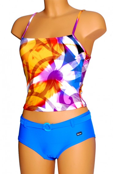 Lycra tankini modieus gedessineerd getailleerd model met vaste softcups en V-hals. Brede slip. Kleur: effen zwarte slip en bovenstuk in zwart/blauw/witte print.