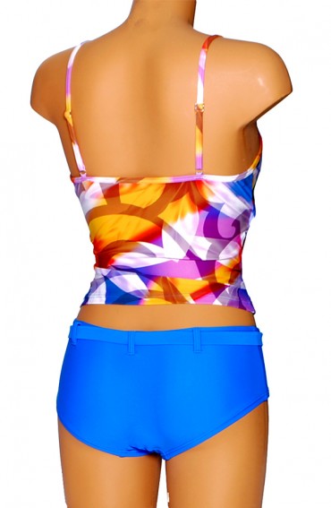 Lycra tankini modieus gedessineerd model met vaste softcups en V-hals. Brede slip. Kleur: effen bruine slip en bovenstuk in bruin/roze print