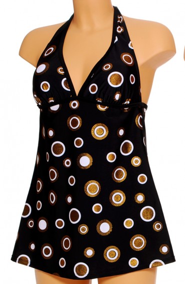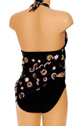 Halter model tankini. Wijd vallend. Met vaste softcups. Rondom de buste met effen zwarte bies afgezet. Mooie slip met brede zijkant. Samenstelling; 80% polyamide/20% elasthan