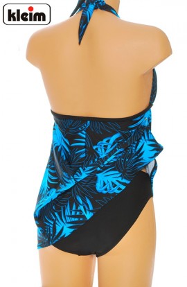 Halter model tankini. Wijd vallend. Met vaste softcups. Rondom de buste met effen zwarte bies afgezet. Mooie slip met brede zijkant. Samenstelling; 80% polyamide/20% elasthan